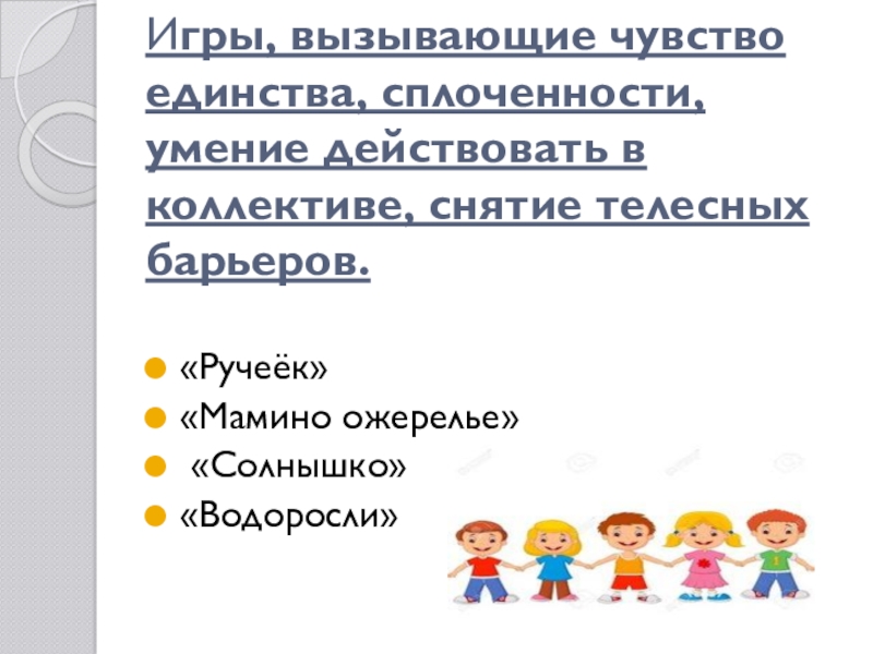 Слайд 20Игры, вызывающие чувство единства, сплоченности, умение действовать в коллективе, снятие телесных