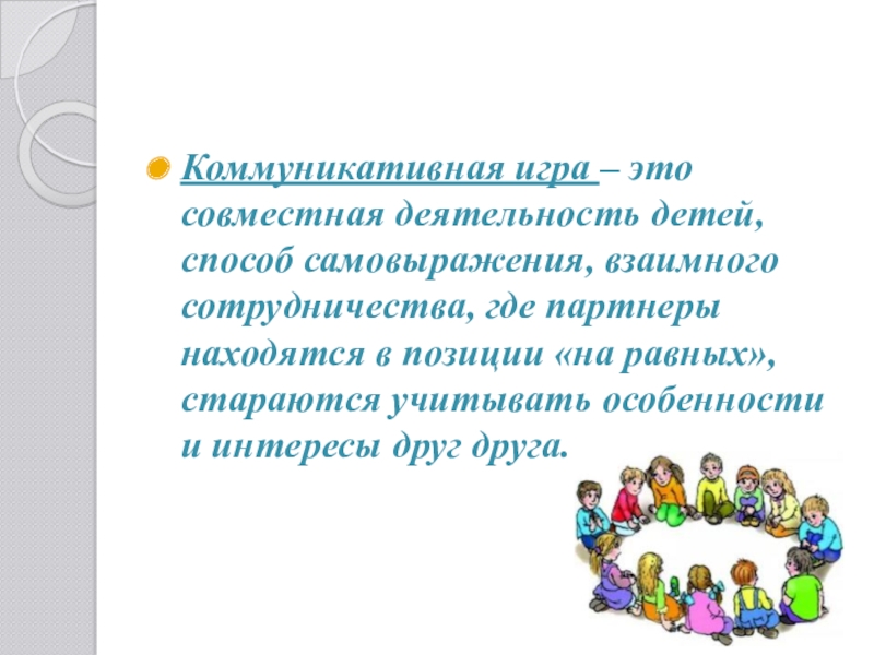 Слайд 6Коммуникативная игра – это совместная деятельность детей, способ самовыражения, взаимного сотрудничества, где