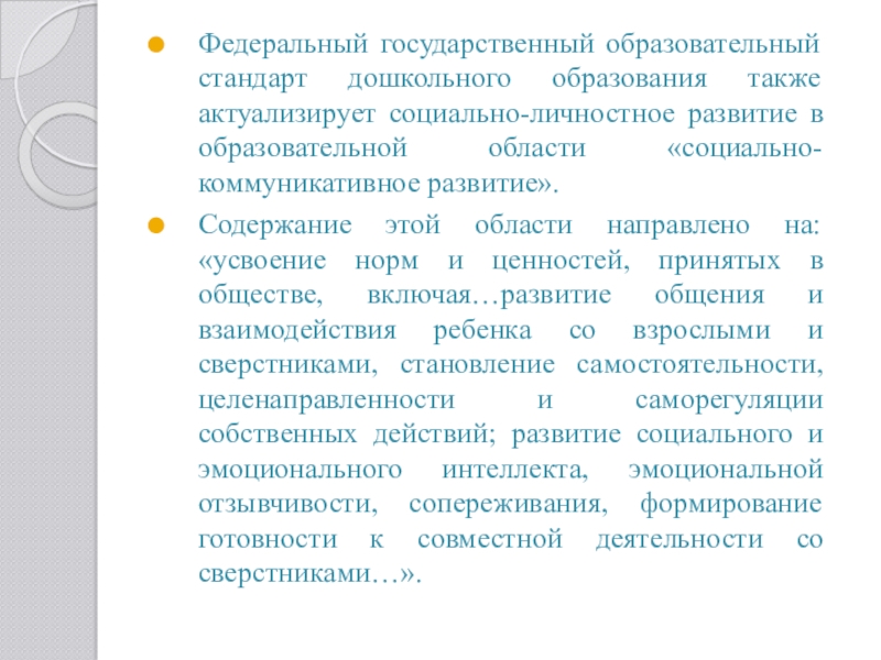 Слайд 5Федеральный государственный образовательный стандарт дошкольного образования также актуализирует социально-личностное развитие в