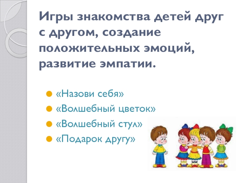 Слайд 18Игры знакомства детей друг с другом, создание положительных эмоций, развитие эмпатии.