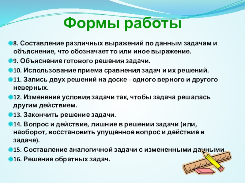 12. Изменение условия задачи так, чтобы задача решалась другим действием.