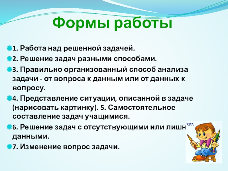 4. Представление ситуации, описанной в задаче (нарисовать картинку). 5. Самостоятельное составление задач учащимися.