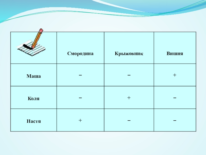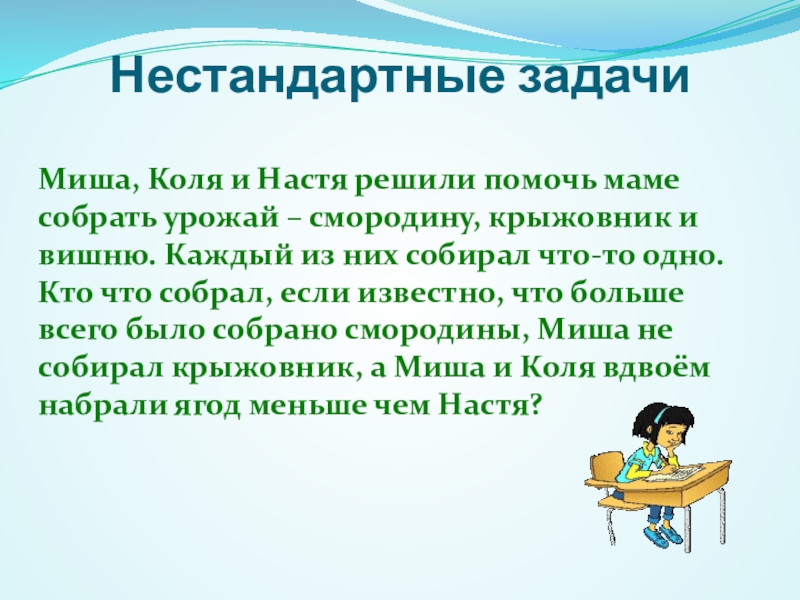 смородину, крыжовник и вишню. Каждый из них собирал что-то одно. Кто что собрал, если известно, что больше всего было собрано смородины, Миша не собирал крыжовник, а Миша и Коля вдвоём набрали ягод меньше чем Настя?