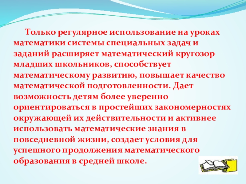 Слайд 15 Только регулярное использование на уроках математики системы специальных задач и заданий