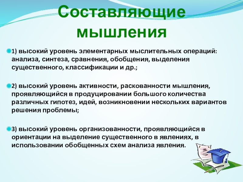 1) высокий уровень элементарных мыслительных операций: анализа, синтеза, сравнения,