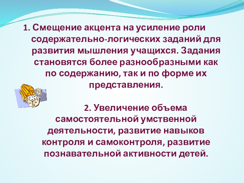 Слайд 141. Смещение акцента на усиление роли содержательно-логических заданий для развития мышления