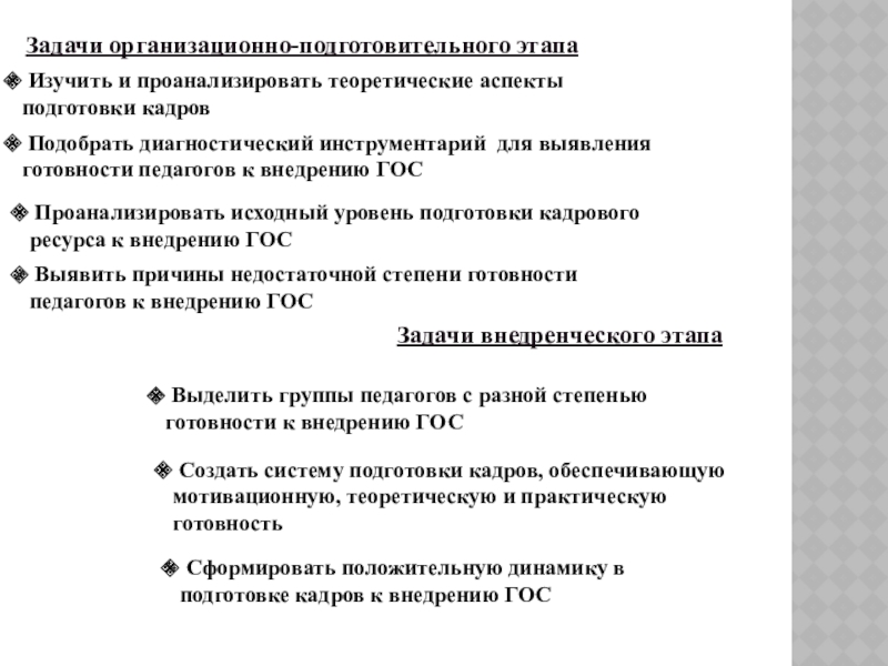 Проанализировать исходный уровень подготовки кадрового ресурса к внедрению ГОС