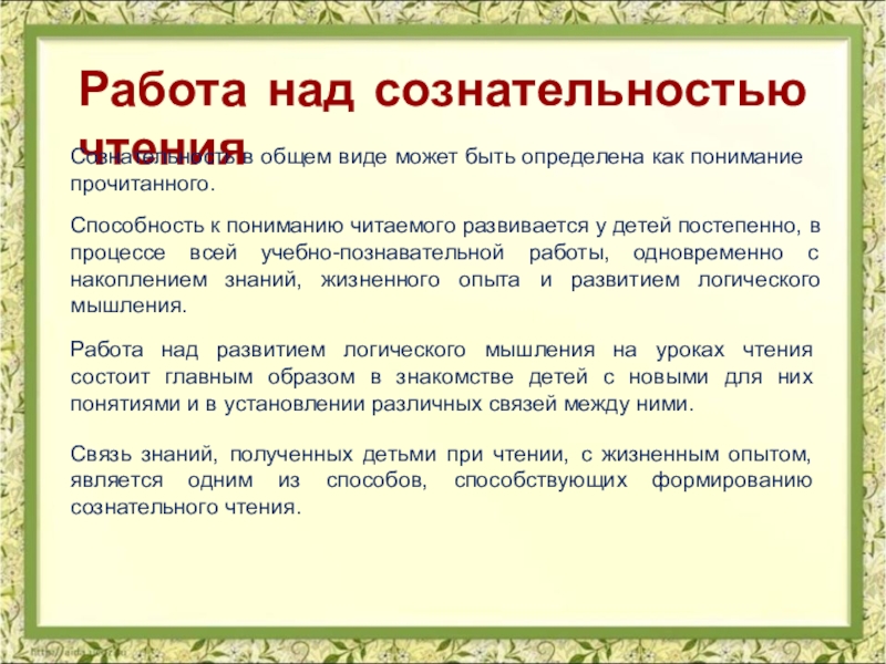 Способность к пониманию читаемого развивается у детей постепенно, в процессе всей учебно-познавательной работы, одновременно с накоплением знаний, жизненного опыта и развитием логического мышления.