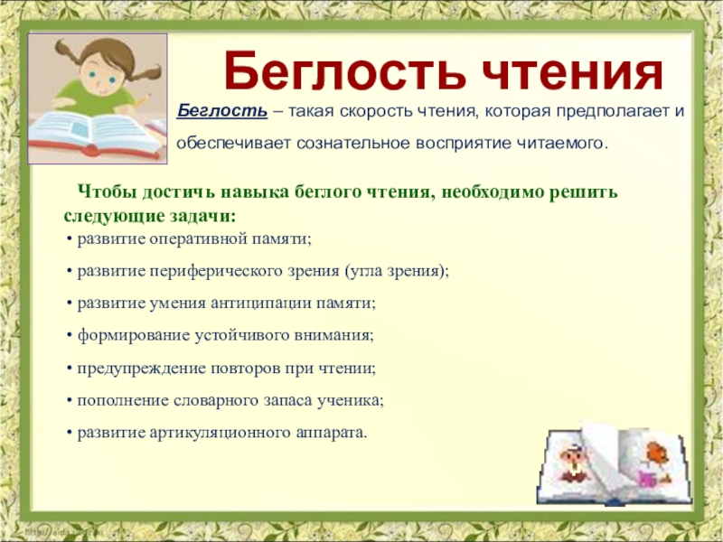 Чтобы достичь навыка беглого чтения, необходимо решить следующие задачи: