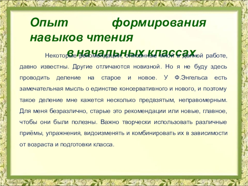 Некоторые рекомендации, описанные мной в данной работе, давно известны. Другие отличаются новизной. Но я не буду здесь проводить деление на старое и новое. У Ф.Энгельса есть замечательная мысль о единстве консервативного и нового, и поэтому такое деление мне кажется несколько предвзятым, неправомерным. Для меня безразлично, старые это рекомендации или новые, главное, чтобы они были полезны. Важно творчески использовать различные приёмы, упражнения, видоизменять и комбинировать их в зависимости от возраста и подготовки класса.