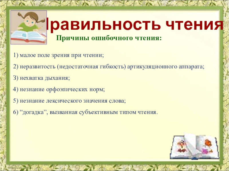 Также на правильность чтения влияет: поза при чтении, нормальное расстояние между глазами и текстом, предварительное чтение
