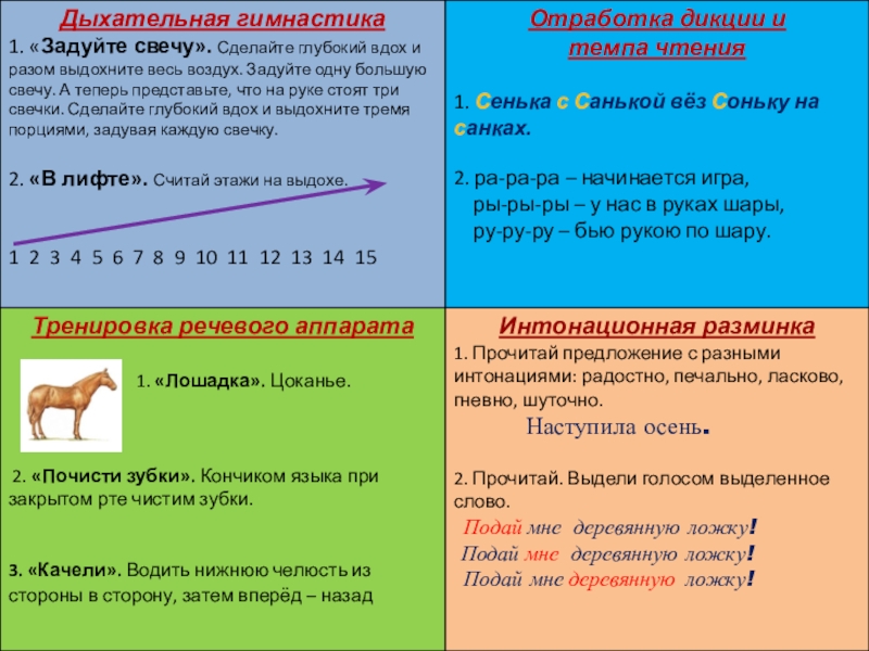 1) каждодневность упражнений (специальные тексты, скороговорки, заучивание наизусть стихов и прозы).