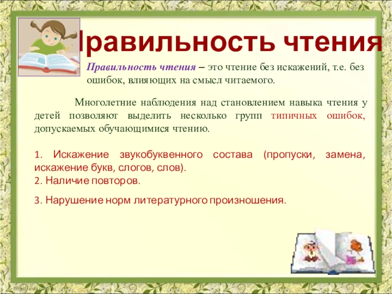 Многолетние наблюдения над становлением навыка чтения у детей позволяют выделить несколько групп типичных ошибок, допускаемых обучающимися чтению.