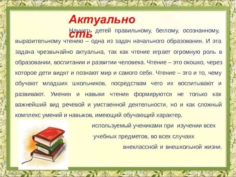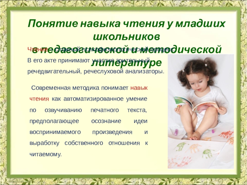 Современная методика понимает навык чтения как автоматизированное умение по озвучиванию печатного текста, предполагающее осознание идеи воспринимаемого произведения и выработку собственного отношения к читаемому.