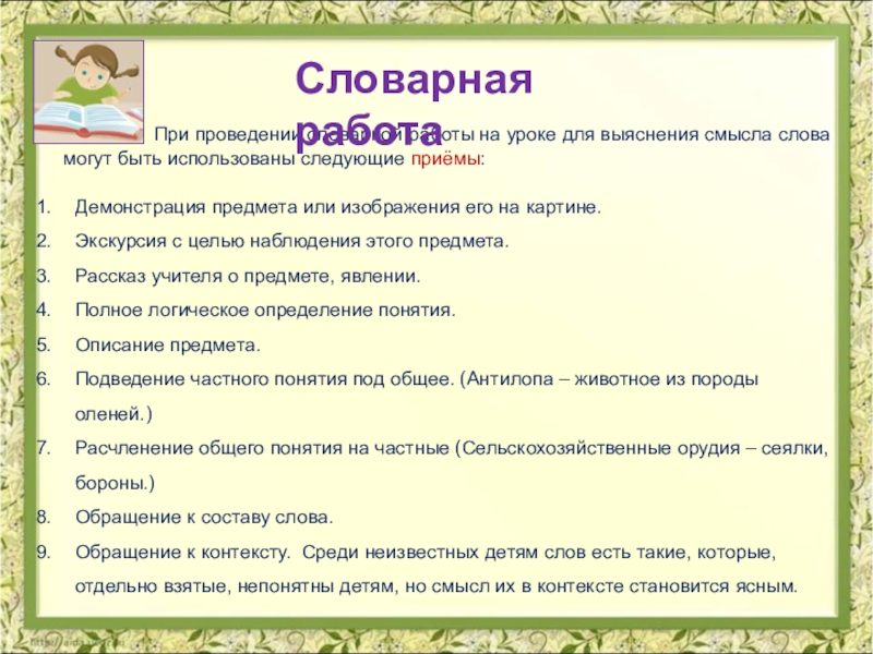 различные виды словарной работы;