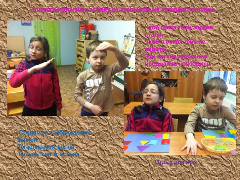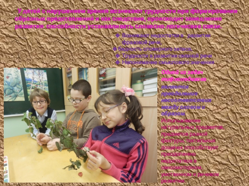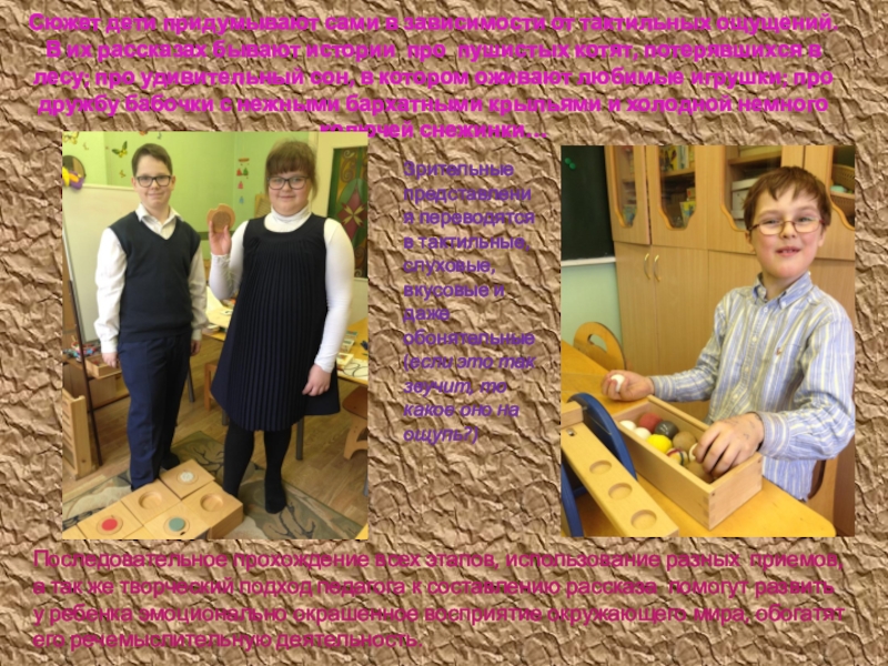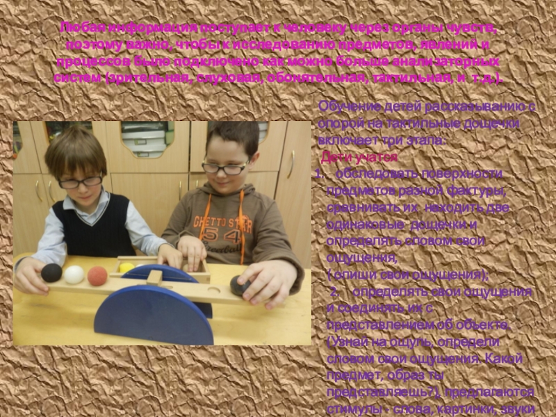 является преодоление несоответствия между словом и образом. Использование натуральных предметов, предметов разной фактуры, тактильных дощечек способствует преодолению недостатков в сенсомоторном, умственном и речевом развитии.