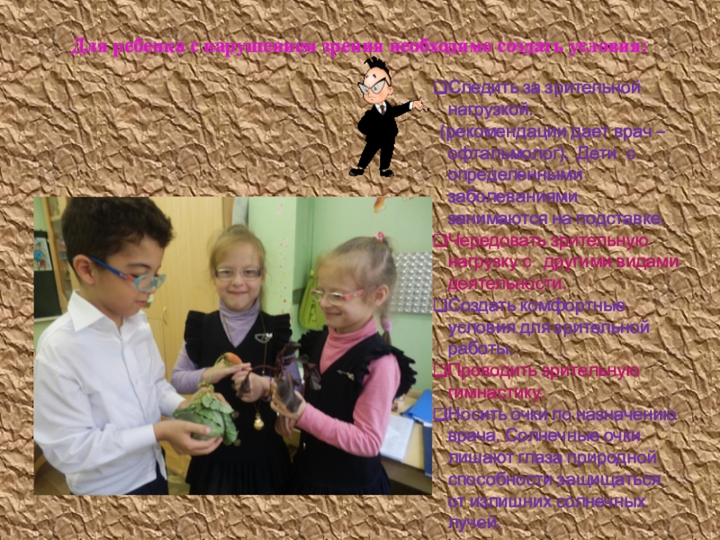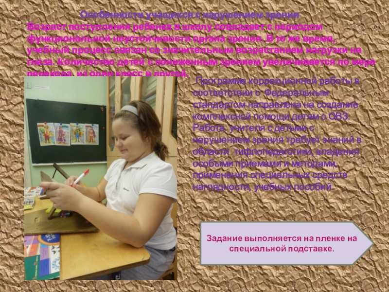 Программа коррекционной работы в соответствии с Федеральным стандартом направлена на создание комплексной помощи детям с ОВЗ. Работа учителя с детьми с нарушением зрения требует знаний в области тифлопедагогики, владения особыми приемами и методами, применения специальных средств наглядности, учебных пособий.