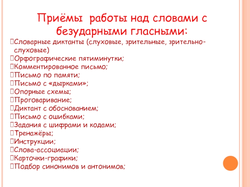 Приёмы работы над словами с безударными гласными:Словарные диктанты (слуховые, зрительные, зрительно-слуховые)Орфографические пятиминутки;Комментированное письмо;Письмо по памяти;Письмо с «дырками»;Опорные