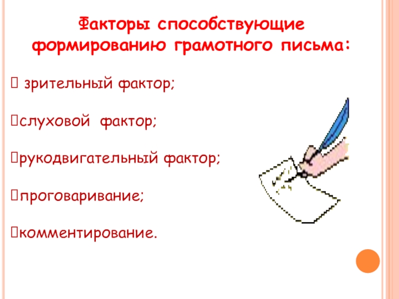Факторы способствующие формированию грамотного письма: зрительный фактор;слуховой фактор;рукодвигательный фактор;проговаривание;комментирование.