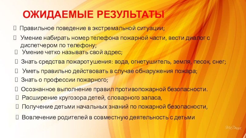 Прививать практические навыки поведения детей при возникновении пожара.