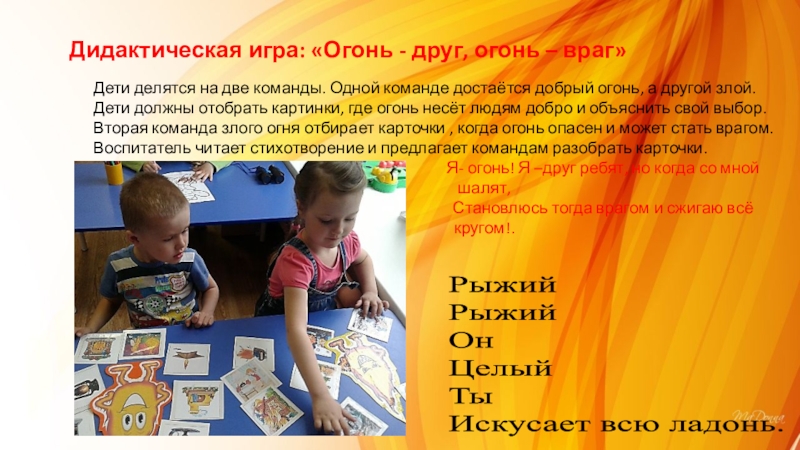 Дети делятся на две команды. Одной команде достаётся добрый огонь, а другой злой. Дети должны отобрать картинки, где огонь несёт людям добро и объяснить свой выбор. Вторая команда злого огня отбирает карточки , когда огонь опасен и может стать врагом. Воспитатель читает стихотворение и предлагает командам разобрать карточки.