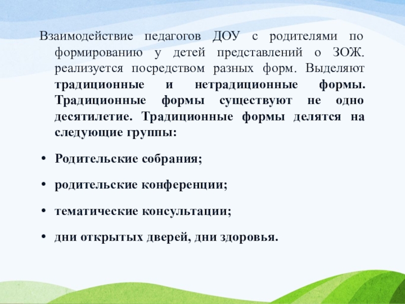 Слайд 5Взаимодействие педагогов ДОУ с родителями по формированию у детей представлений о