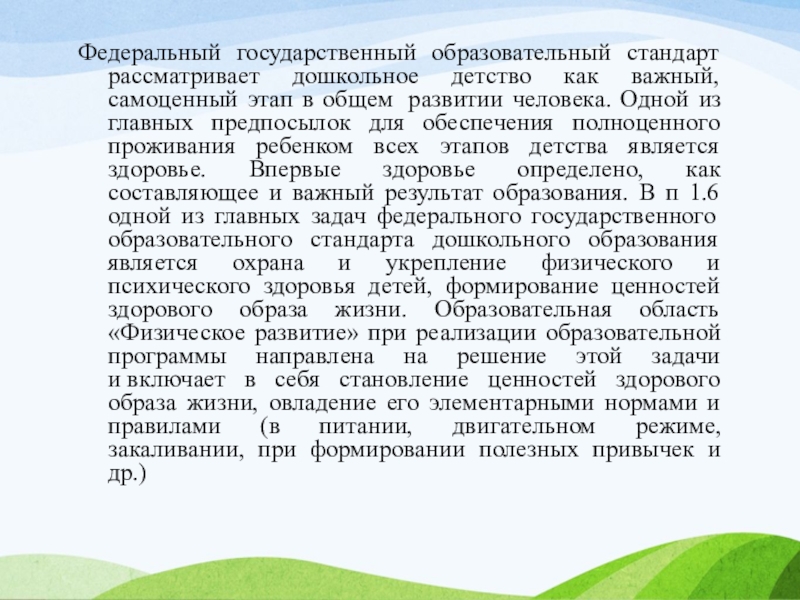 в общем развитии человека. Одной из главных предпосылок для обеспечения полноценного проживания ребенком всех этапов детства является здоровье. Впервые здоровье определено, как составляющее и важный результат образования. В п 1.6 одной из главных задач федерального государственного образовательного стандарта дошкольного образования является охрана и укрепление физического и психического здоровья детей, формирование ценностей здорового образа жизни. Образовательная область «Физическое развитие» при реализации образовательной программы направлена на решение этой задачи и включает в себя становление ценностей здорового образа жизни, овладение его элементарными нормами и правилами (в питании, двигательном режиме, закаливании, при формировании полезных привычек и др.)