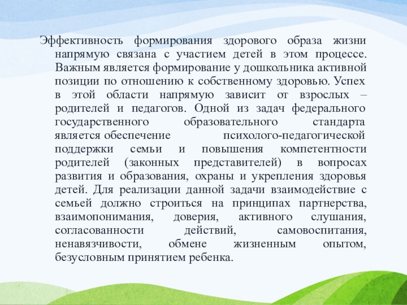 этом процессе. Важным является формирование у дошкольника активной позиции по отношению к собственному здоровью. Успех в этой области напрямую зависит от взрослых – родителей и педагогов. Одной из задач федерального государственного образовательного стандарта является обеспечение психолого-педагогической поддержки семьи и повышения компетентности родителей (законных представителей) в вопросах развития и образования, охраны и укрепления здоровья детей. Для реализации данной задачи взаимодействие с семьей должно строиться на принципах партнерства, взаимопонимания, доверия, активного слушания, согласованности действий, самовоспитания, ненавязчивости, обмене жизненным опытом, безусловным принятием ребенка.