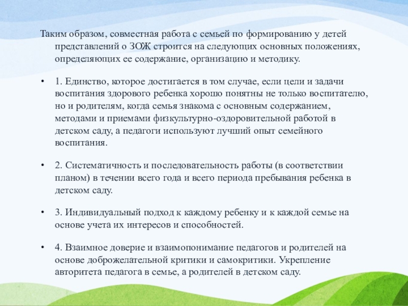 1. Единство, которое достигается в том случае, если цели и задачи воспитания здорового ребенка хорошо понятны не только воспитателю, но и родителям, когда семья знакома с основным содержанием, методами и приемами физкультурно-оздоровительной работой в детском саду, а педагоги используют лучший опыт семейного воспитания.