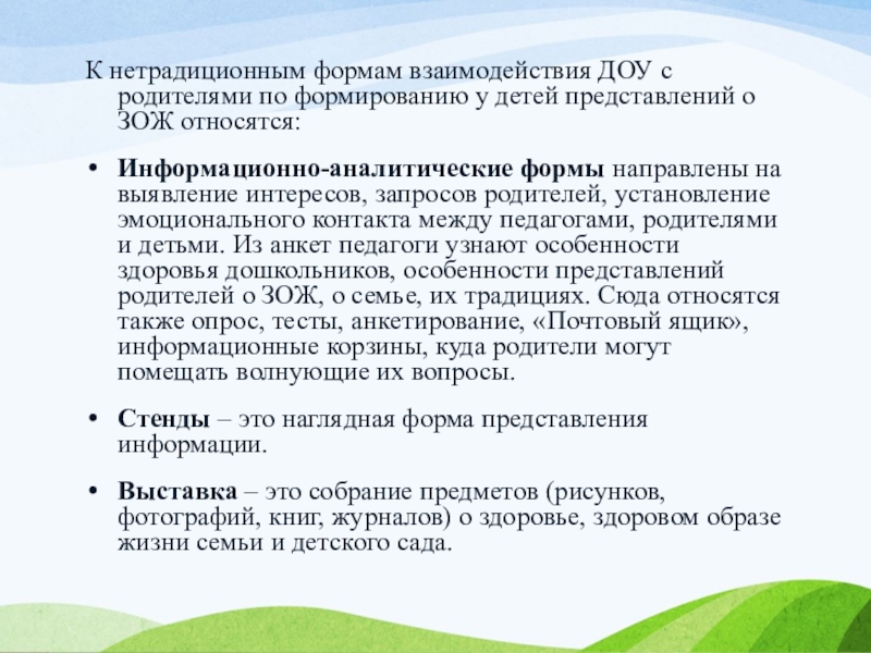 Информационно-аналитические формы направлены на выявление интересов, запросов родителей, установление эмоционального контакта между педагогами, родителями и детьми. Из анкет педагоги узнают особенности здоровья дошкольников, особенности представлений родителей о ЗОЖ, о семье, их традициях. Сюда относятся также опрос, тесты, анкетирование, «Почтовый ящик», информационные корзины, куда родители могут помещать волнующие их вопросы.