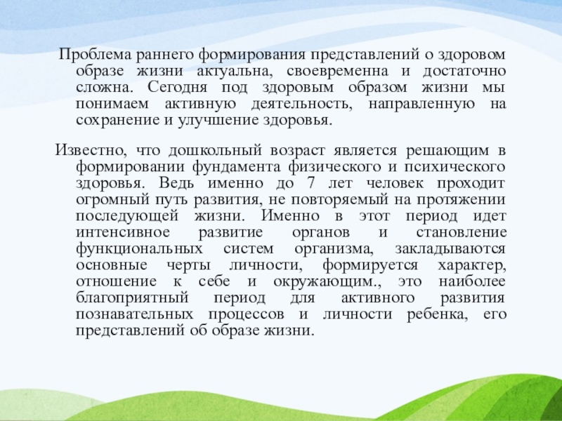 Слайд 2 Проблема раннего формирования представлений о здоровом образе жизни актуальна, своевременна и