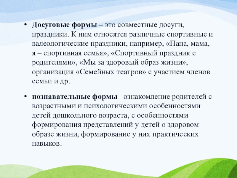 познавательные формы– ознакомление родителей с возрастными и психологическими особенностями детей дошкольного возраста, с особенностями формирования представлений у детей о здоровом образе жизни, формирование у них практических навыков.
