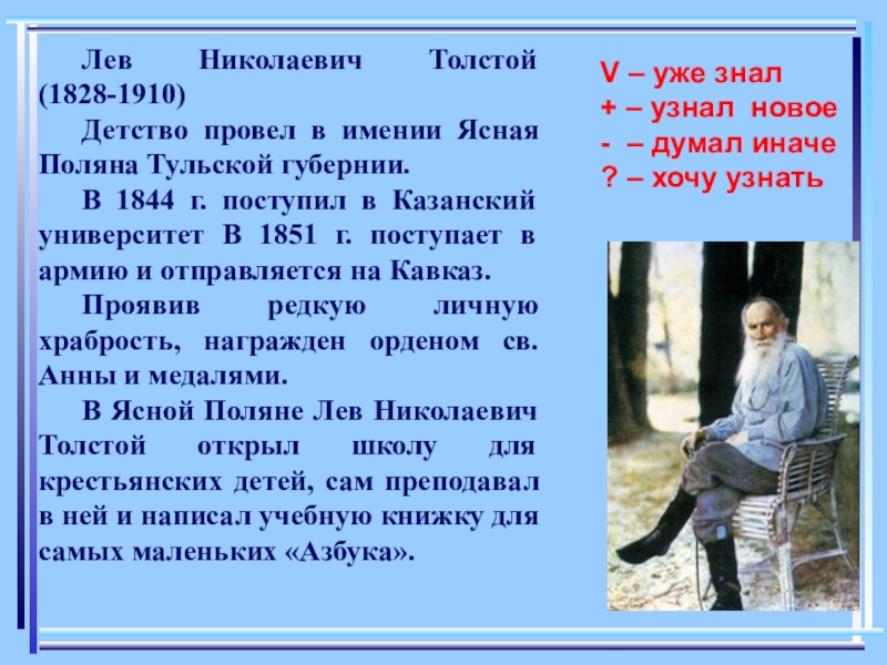 В Ясной Поляне Лев Николаевич Толстой открыл школу для крестьянских детей, сам преподавал в ней и написал учебную книжку для самых маленьких «Азбука».