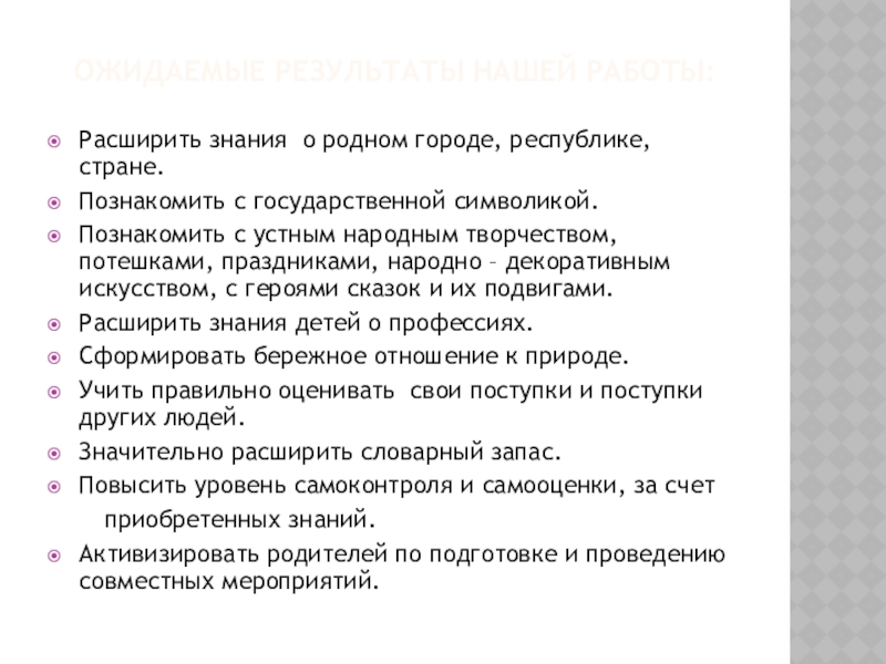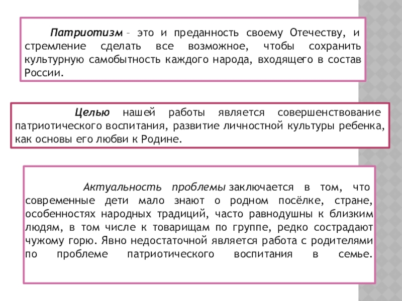 Целью нашей работы является совершенствование патриотического воспитания, развитие личностной культуры ребенка, как основы его любви к Родине.