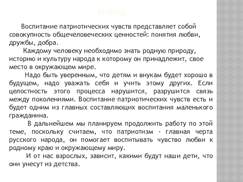 Патриотизм – это и преданность своему Отечеству, и стремление сделать все возможное, чтобы сохранить культурную самобытность каждого народа, входящего в состав России.