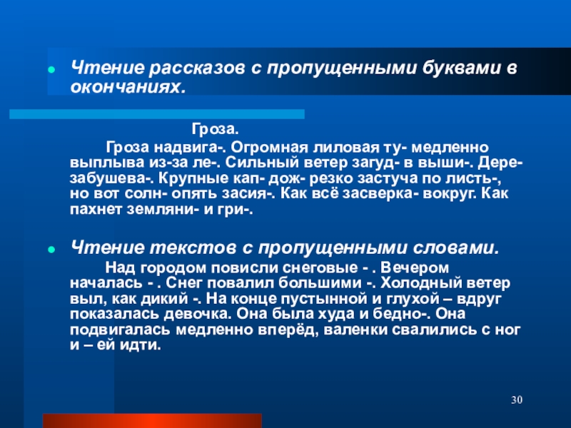 Слайд 30Чтение рассказов с пропущенными буквами в окончаниях.