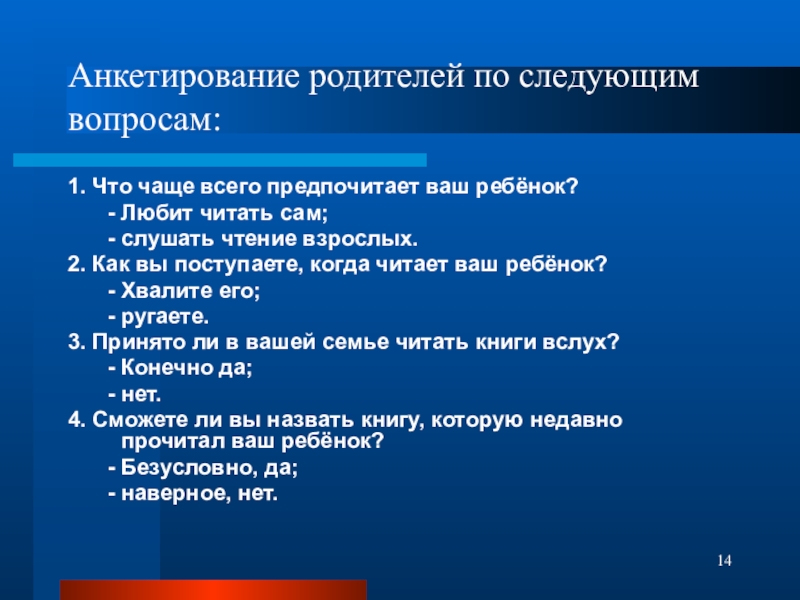 Анкетирование родителей по следующим вопросам: