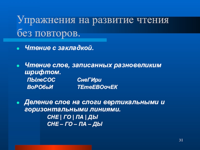 Слайд 31Упражнения на развитие чтения без повторов.