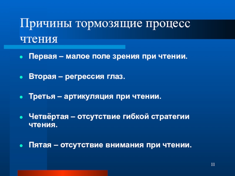 Слайд 11Причины тормозящие процесс чтения