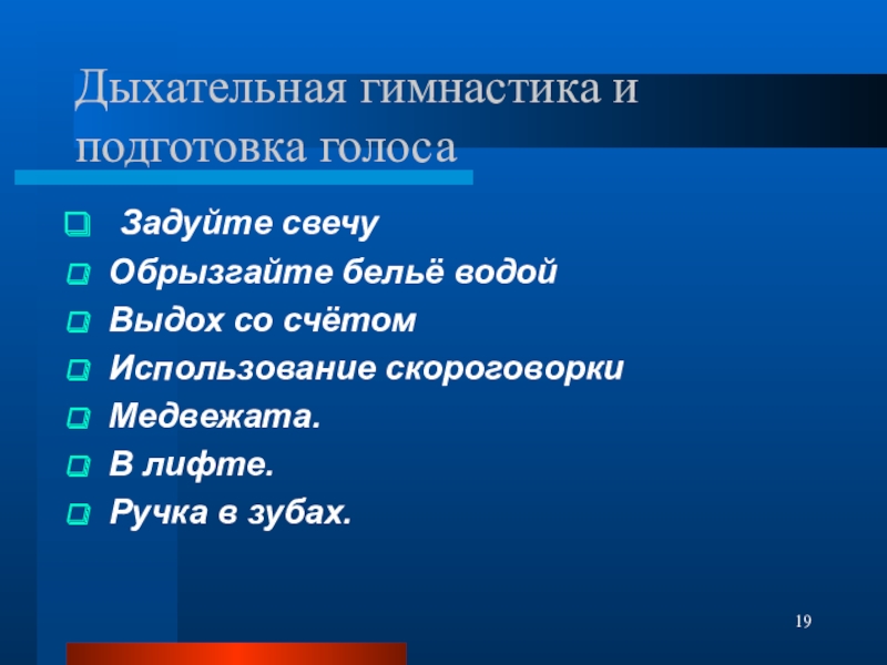Слайд 19Дыхательная гимнастика и подготовка голоса