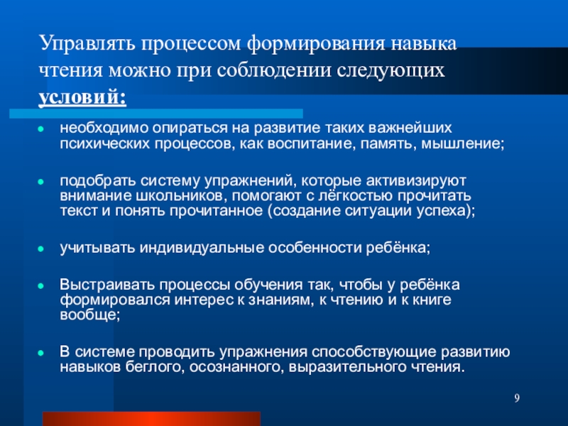 Слайд 9Управлять процессом формирования навыка чтения можно при соблюдении следующих условий: