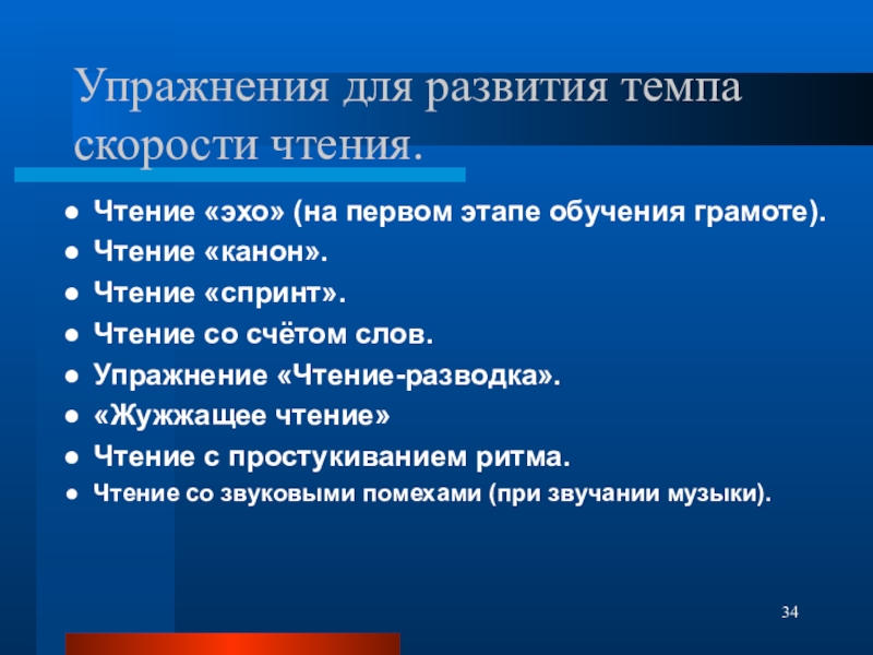 Слайд 34Упражнения для развития темпа скорости чтения.