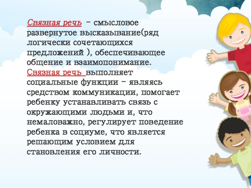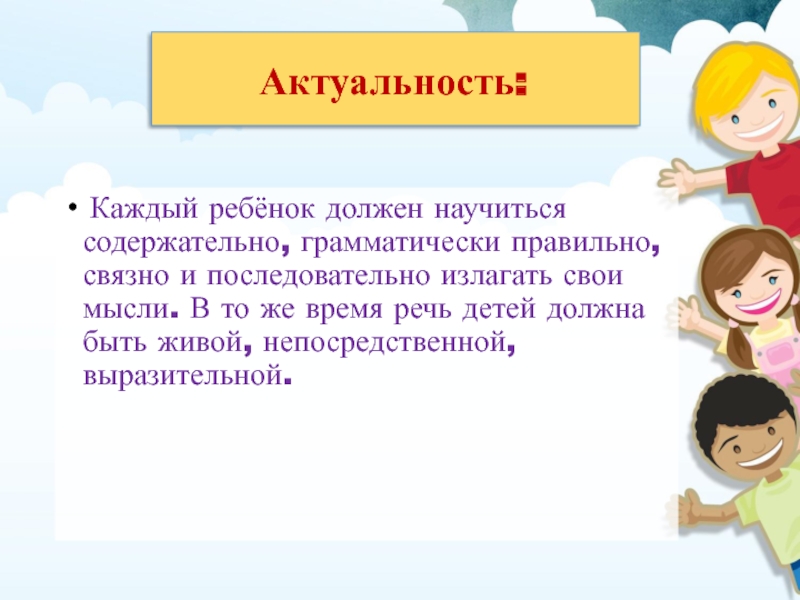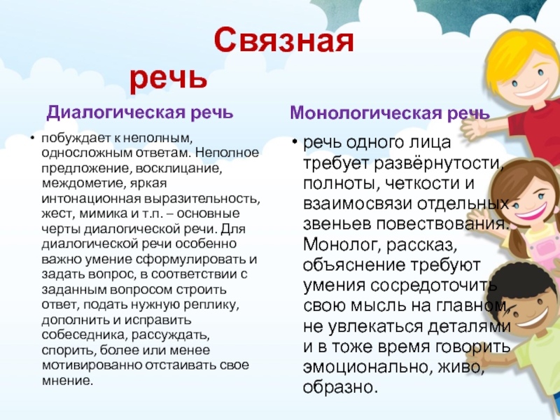 речь одного лица требует развёрнутости, полноты, четкости и взаимосвязи отдельных звеньев повествования. Монолог, рассказ, объяснение требуют умения сосредоточить свою мысль на главном, не увлекаться деталями и в тоже время говорить эмоционально, живо, образно.