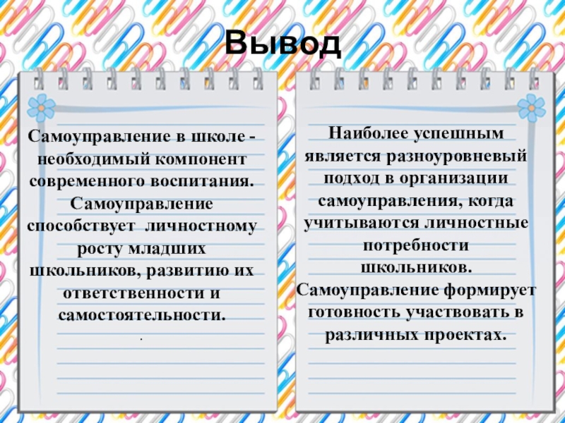 Наиболее успешным является разноуровневый подход в организации самоуправления, когда учитываются личностные потребности