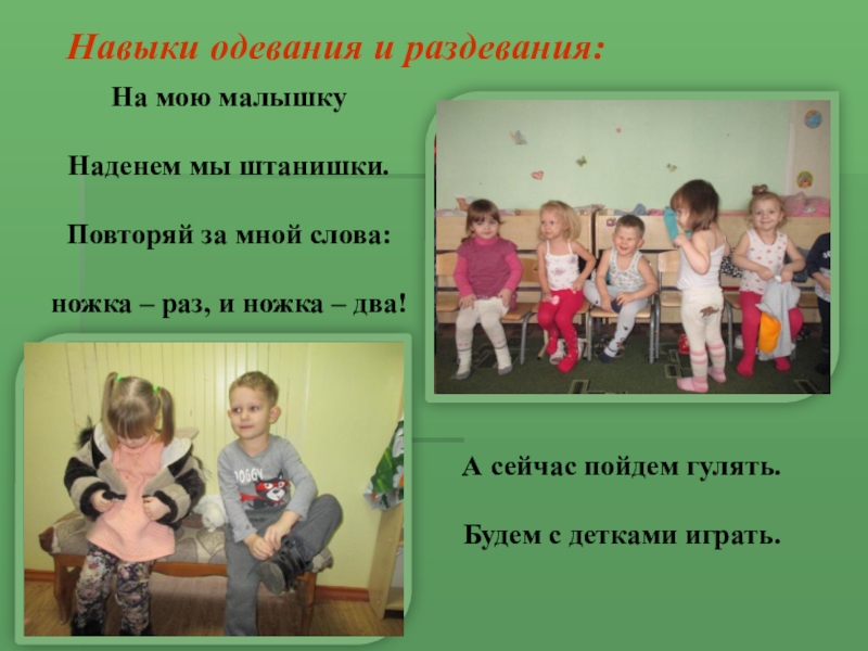 2. Застёгивание пуговиц, завязывание поясков, бантов на одежде при небольшой помощи взрослых.