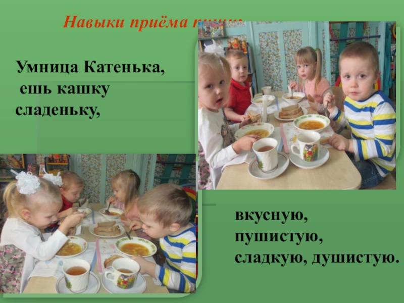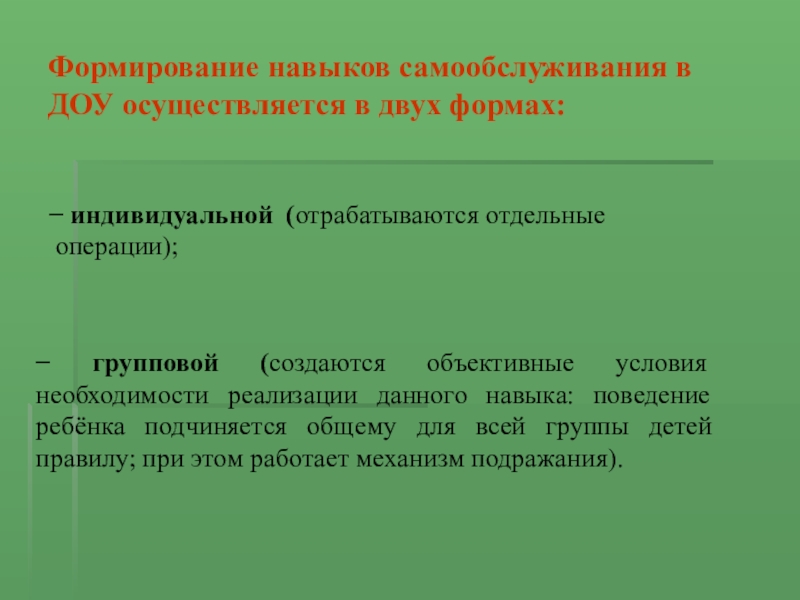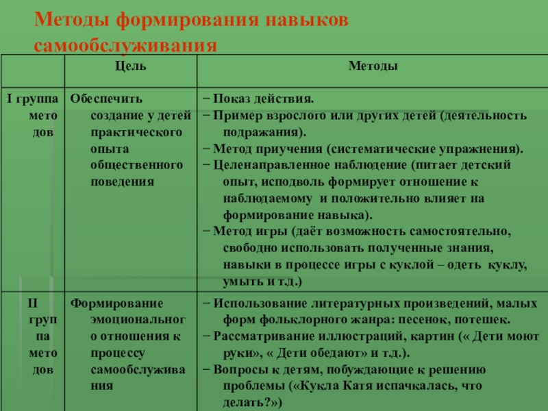 − групповой (создаются объективные условия необходимости реализации данного навыка: поведение ребёнка подчиняется общему для всей группы детей правилу; при этом работает механизм подражания).