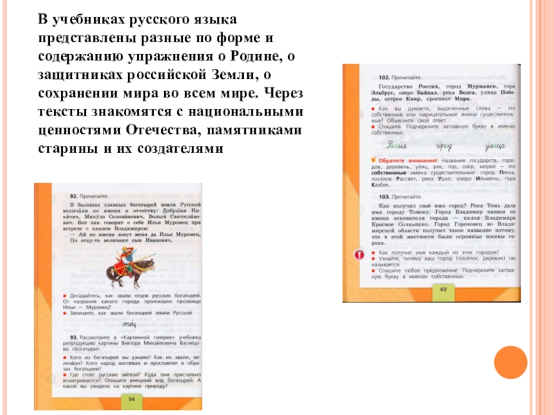 о Родине, о защитниках российской Земли, о сохранении мира во всем мире. Через тексты знакомятся с национальными ценностями Отечества, памятниками старины и их создателями