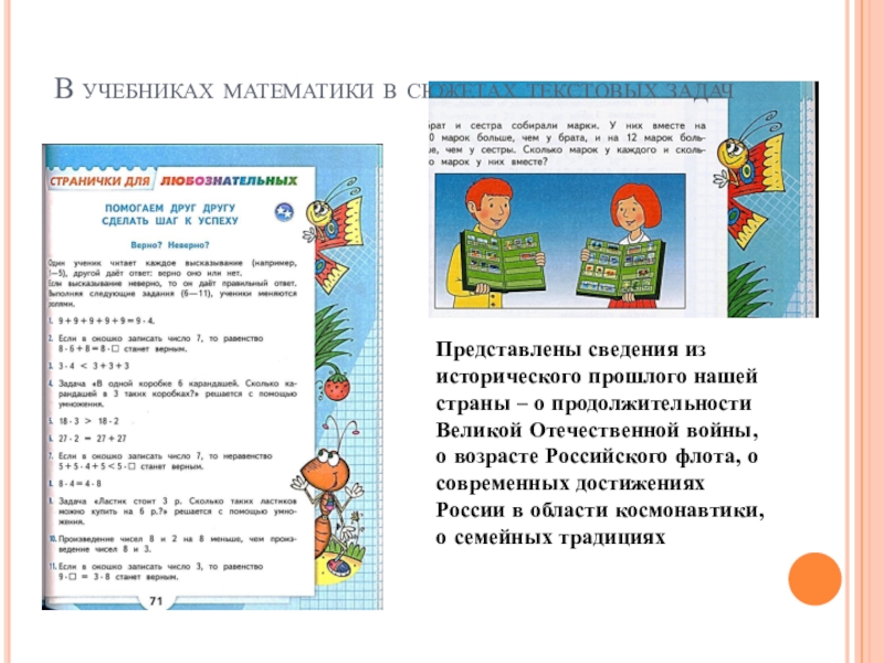Слайд 15В учебниках математики в сюжетах текстовых задач