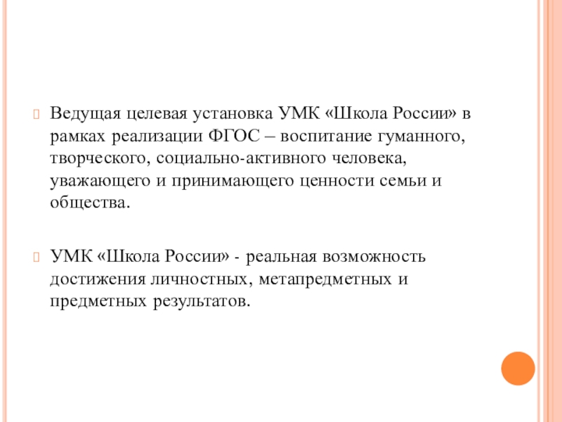 Слайд 6Ведущая целевая установка УМК «Школа России» в рамках реализации ФГОС –