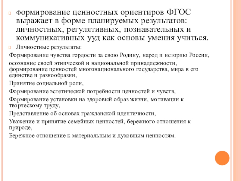 Слайд 24Формирование ценностных ориентиров ФГОС выражает в форме планируемых результатов: личностных, регулятивных,